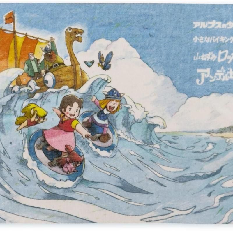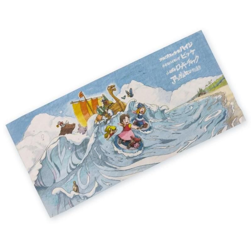 ハイジを中心に、「小さなバイキングビッケ」、「山ねずみロッキーチャック」、「アンデルセン物語」のズイヨーキャラクターズたちが楽しく波乗りしているミニフェイスタオルです☆