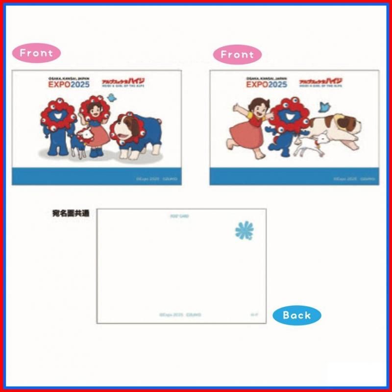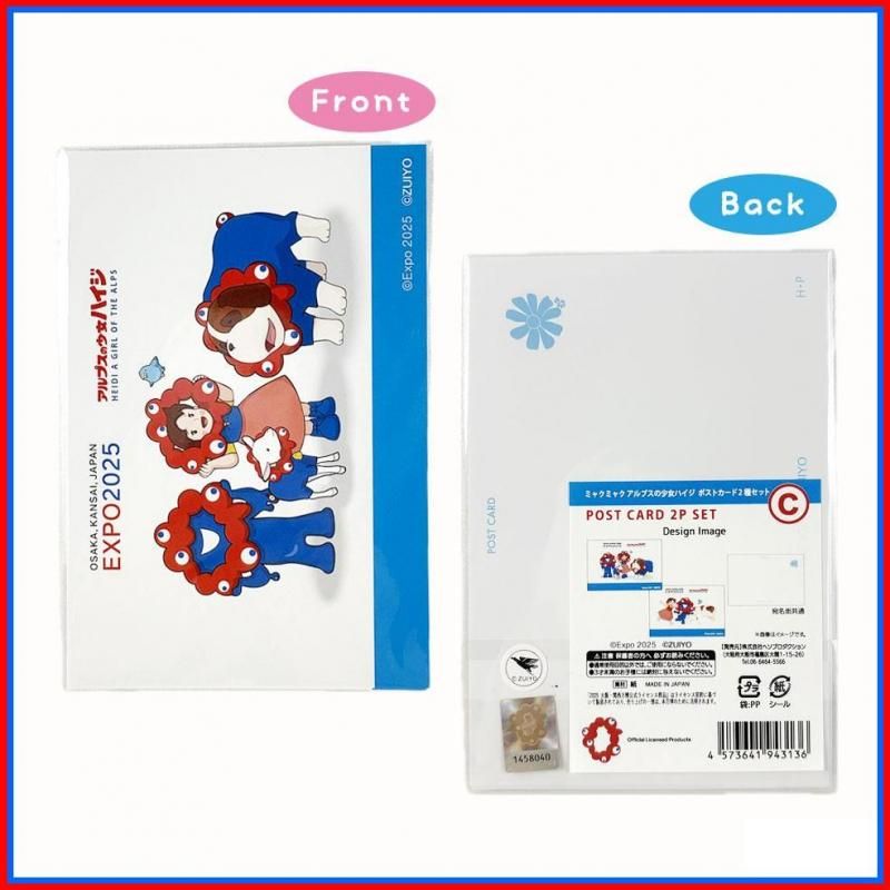 ミャクミャクとハイジが楽しく遊ぶ柄が楽しいポストカードセット(各柄2枚セット)です。